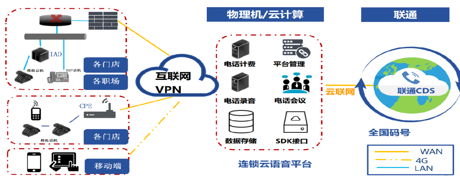 为连锁企业一点下单,全国部署,统一集中管理全国门店语音。对于未覆盖资源区域,免施工,可快速部署提供低廉的电话会议、群组沟通模式。通话清单随时可查,费用报表清晰可得全国门店内部分机,沟通免费。无需各门店申请开通,总部统一申请。免去网络建设、维护烦恼,即需即用。各门店语音网络无成本组网,内部通话免费